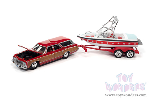 Round 2 Johnny Lightning - Hulls & Haulers Release 1 | Chevrolet® Caprice with Mastercraft Boat & Trailer (1973, 1/64 scale diecast model car, Red woody, White & Red) JLSP204/24B