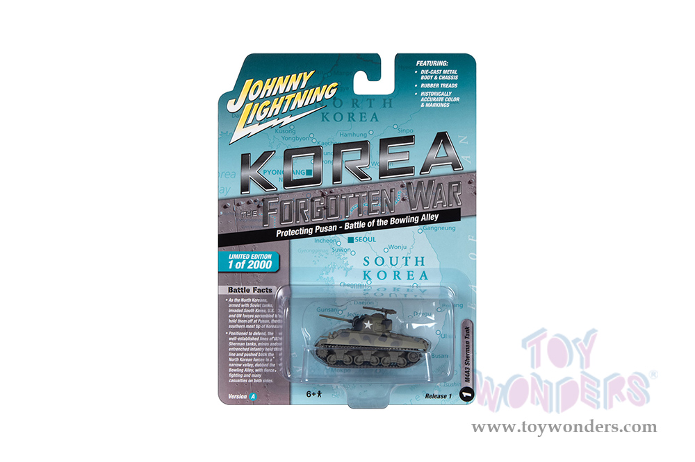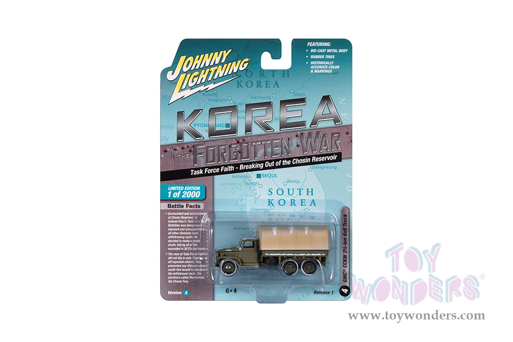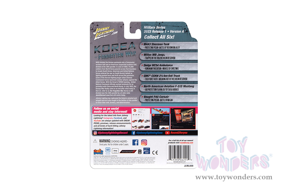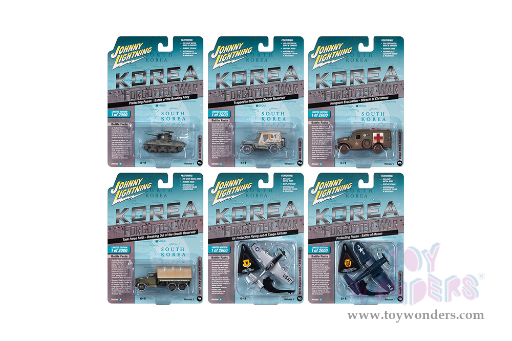 JLML009/48A Round 2 Johnny Lightning - Military 2023 Release 1 Set A "Korea: The Forgotten War". 1:64 scale diecast collectible models. These cars are 2.5" to 3.5" long, authentic factory colors, 6-Car Set. Historically accurate colors and markings. Some models have opening hoods. Factory sealed case. Limited edition to 2000 pcs. Manufactured by Round 2. Each car individually blister carded. Card size: 5.5" x 7.5".