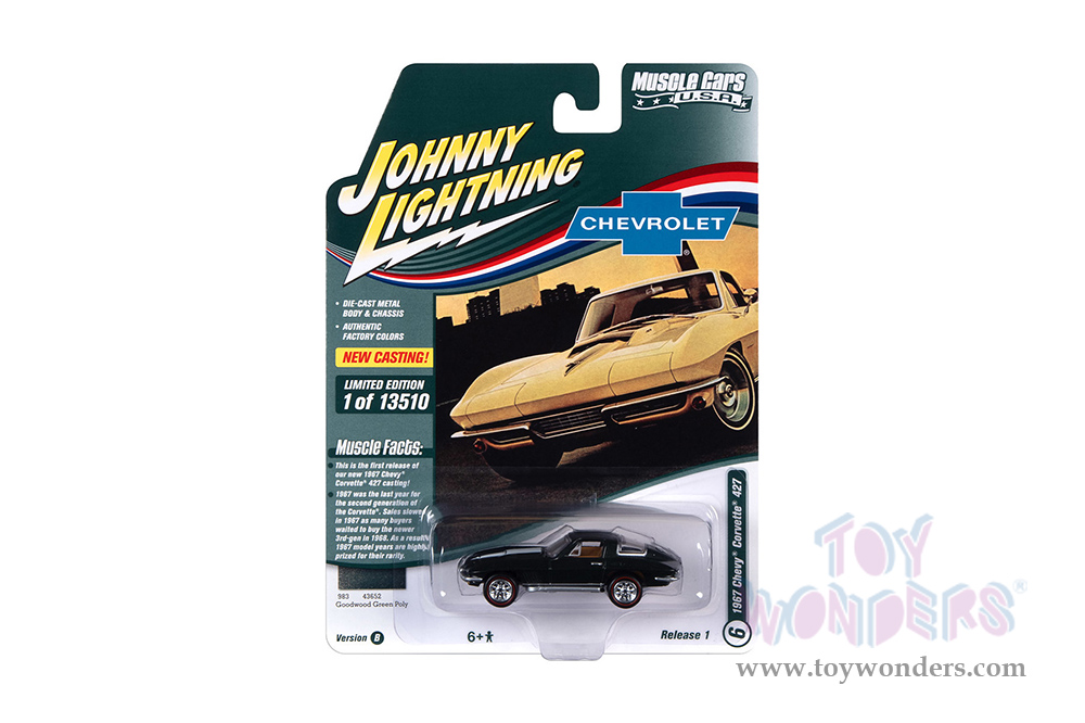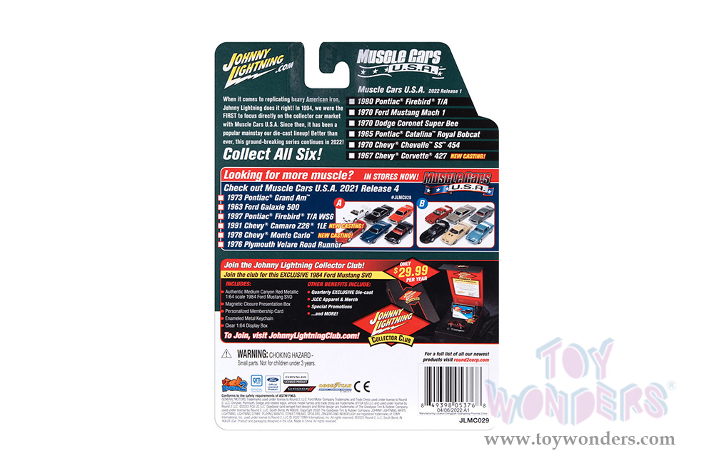 JLMC029/48B Round 2 Johnny Lightning - Muscle Cars U.S.A. 2022 Release 1 Set B. 1:64 scale diecast collectible model car. These cars are approx. 2.75" to 3.25" long, authentic factory colors, opening hoods, 6-Car Set. Factory sealed case. Limited edition. GM is a trademark of the General Motors Corporation. Manufactured by Round 2. Each car individually blister carded. Card size: 6" x 7.25".