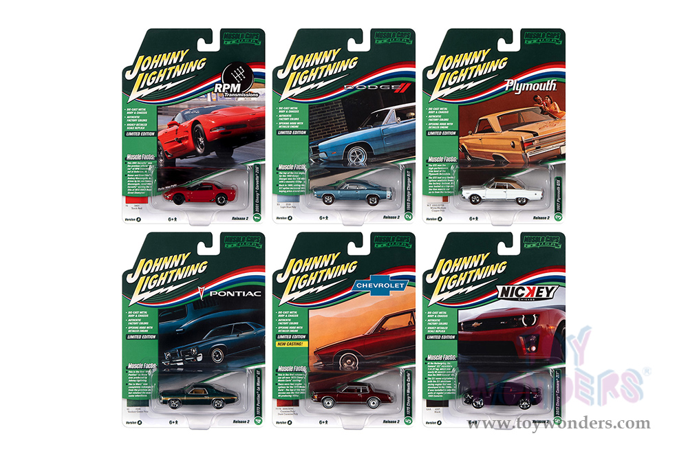 JLMC030/48A Round 2 Johnny Lightning - Muscle Cars U.S.A. 2022 Release 2 Set A. 1:64 scale diecast collectible model car. These cars are approx. 2.75" to 3.25" long, authentic factory colors, some with opening hoods, 6-Car Set. Factory sealed case. Limited edition. GM is a trademark of the General Motors Corporation. Manufactured by Round 2. Each car individually blister carded. Card size: 6" x 7.25".