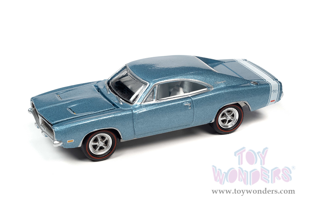 • 1969 Dodge Charger R/T in B3 Blue Metallic with White R/T Rear Stripe.
