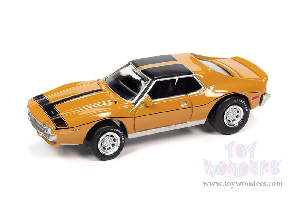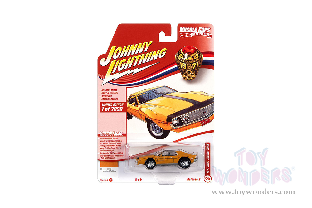JLSP152/24B Round 2 Johnny Lightning - Muscle Cars U.S.A. | 1971 AMC Javelin AMX Hardtop Class of 1971. 1:64 scale diecast collectible model. 6-car set. These cars are 2.75" long. Special Edition. 6 pcs/inner. Manufactured by Round 2. Each car individually blister carded. Card size: 5.5" x 7.5". Item JLSP152/24B is in Yellow with Black Stripes. Limited edition to 7298 pcs.