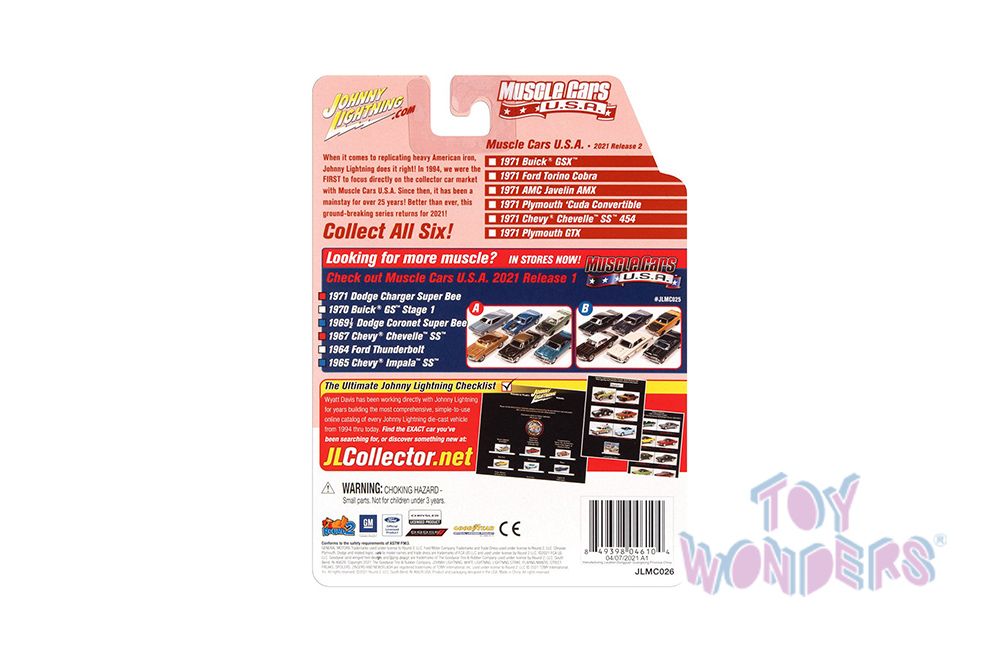JLSP154/24B Round 2 Johnny Lightning - Muscle Cars U.S.A. | 1971 Chevrolet® Chevelle SS 454 Hardtop Class of 1971. 1:64 scale diecast collectible model. 6-car set. These cars are 2.75" long. Special Edition. 6 pcs/inner. Manufactured by Round 2. Each car individually blister carded. Card size: 5.5" x 7.5". Item JLSP154/24B is in Black with white stripes. Limited edition to 7754 pcs.