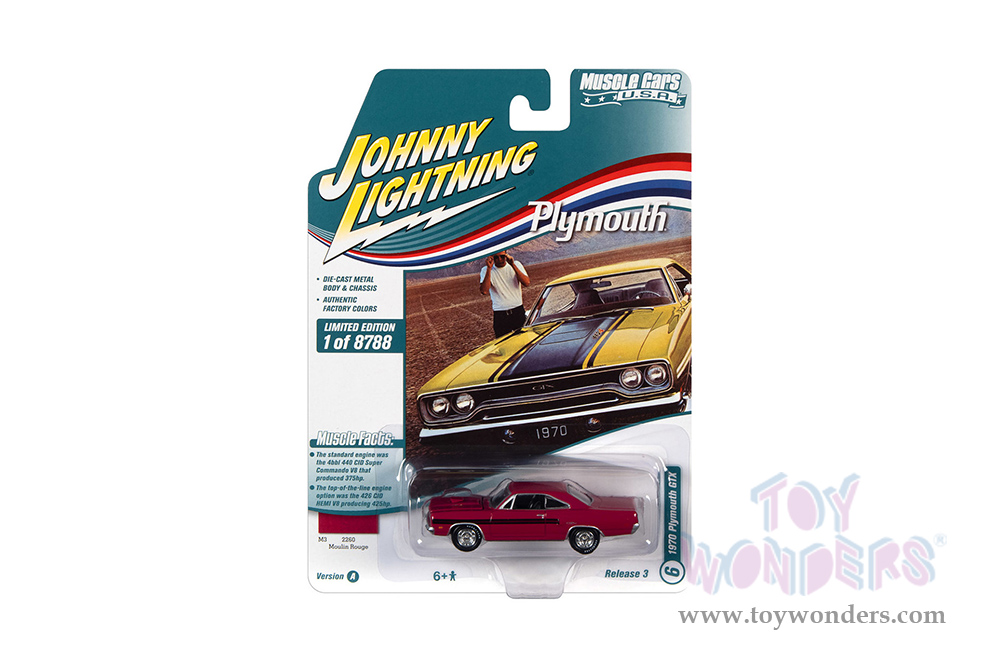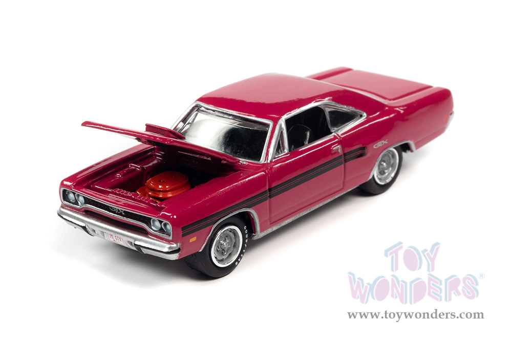 Round 2 Johnny Lightning - Muscle Cars U.S.A. | Plymouth GTX (1970, 1/64 scale diecast model car, Moulin Rouge w/Black Dual Side Stripes) JLSP177/24A