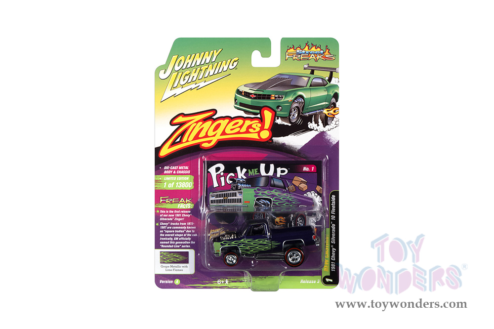 Round 2 Johnny Lightning - Street Freaks 2021 Release 3 Set A | Chevrolet® Silverado 10 Fleetside - Zingers! (1981, 1/64 scale diecast model car, Grape Metallic with Lime Flames) JLSP178/24A