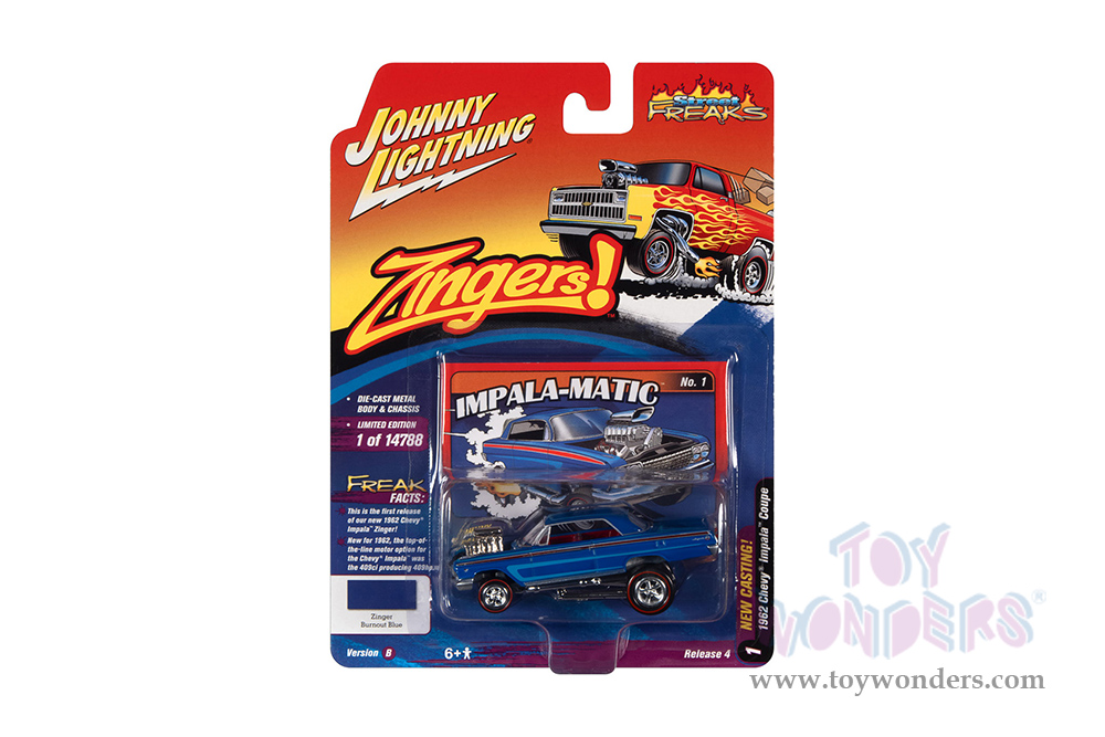 JLSP207/24B Round 2 Johnny Lightning - Street Freaks 2021 Release 4 Set B | 1962 Chevrolet® Impala™ Coupe - Zingers!. 1:64 scale diecast collectible model car. These cars are 3" long, authentic factory colors, 6-Car Set, factory sealed case and limited edition.  Manufactured by Round 2. Each car individually blister carded. Card size: 6" x 7.25". Limited edition to 14788 pcs.
