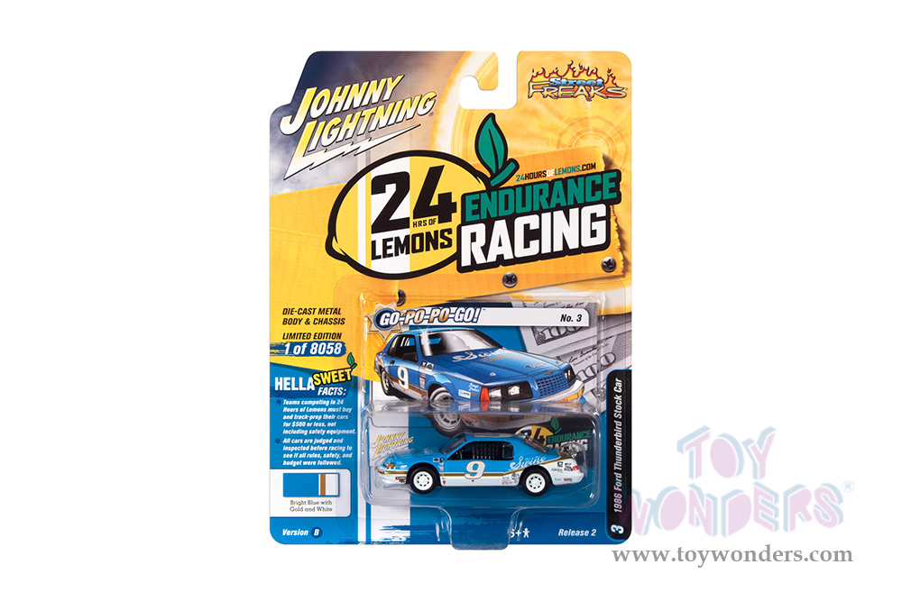 Round 2 Johnny Lightning - Street Freaks | Ford Thunderbird Stock Car #9 "Go-Po-Po-Go!" - 24hrs of LeMons (1986, 1/64 scale diecast model car, Bright Blue w/White & Gold Stripes) JLSP252/24B