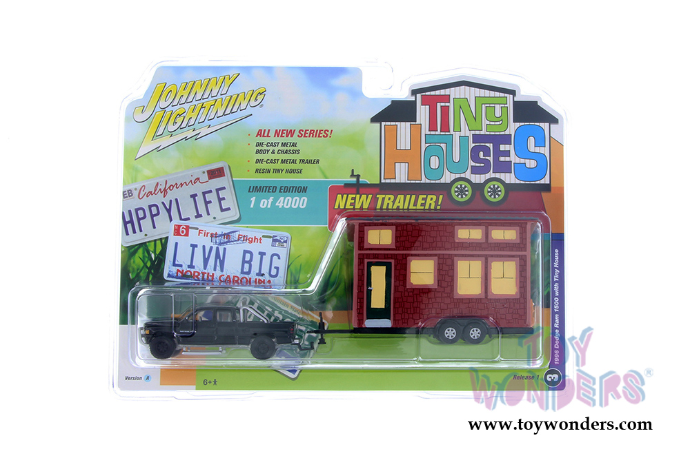 JLTH001/24A Round 2 Johnny Lightning - Tiny Houses Release 1 set A. 1:64 scale diecast collectible model. The cars are 3.5" long diecast metal cars. The tiny houses are 4.5" L made of resin and hand painted. Opening hoods. Each set individually blister carded. Card size: 10" x 7.5". Manufactured by Round 2. JLTH001/24A is in assorted colors. Limited edition to 4000 pcs.