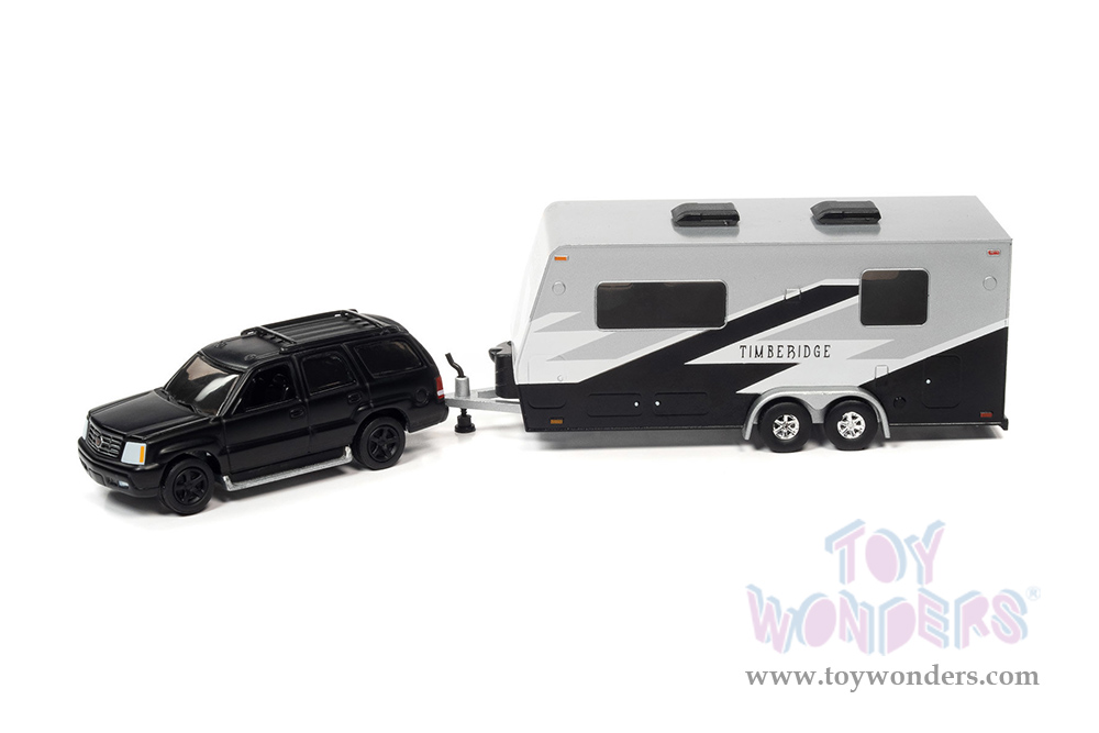 Round 2 Johnny Lightning - Truck and Trailer Release 1 | Cadillac® Escalade with Camper Trailer (2005, 1/64 scale diecast model car, Custom Matte Black) JLSP201/24B