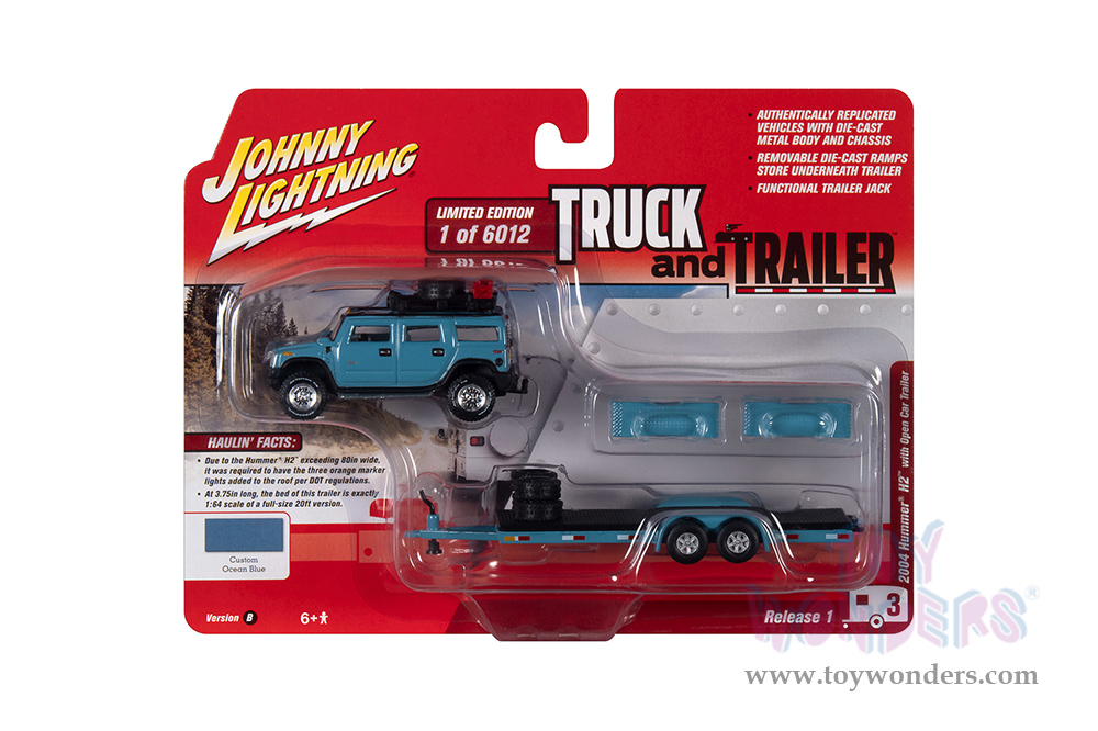 Round 2 Johnny Lightning - Truck and Trailer Release 1 | Hummer® H2 with Open Car Trailer (2004, 1/64 scale diecast model car, Custom Ocean Blue) JLSP202/24B