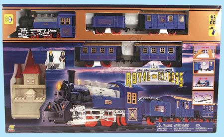9682 Royal Express Train. Train set includes cars, cabooses, tracks, castle, 2 figurines. Requires 2 "AA" batteries (not included). Box size: 23.5"L x 2.5"W x 14"H.