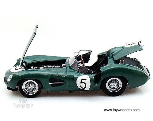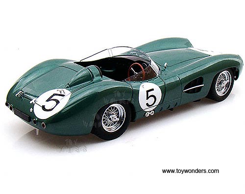 SC106GN Shelby - 1959 Aston Martin DBR1 Convertible #5. Shelby American 50 years 1962-2012. 1:18 scale diecast collectible model car. This Aston-Martin DBR1 is an 8.5"L x 3.25"W x 2"H die cast metal car with openable doors, hood and trunk, PVC tires, detailed engine, interior & chassis. Mounted on a display platform. This 1959 Aston Martin DBR1 is manufactured by Shelby Collectibles, Inc. Individually packed in a window box. Box size: 12.5"L x 5.75"W x 5"H. SC106GN is in GREEN color.