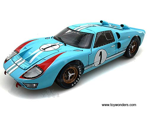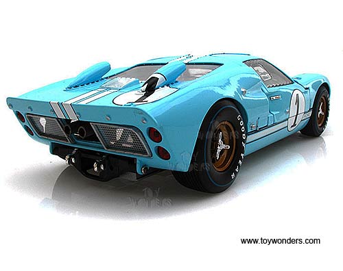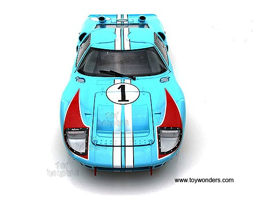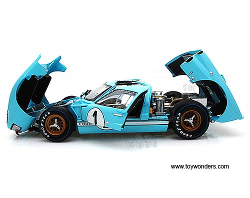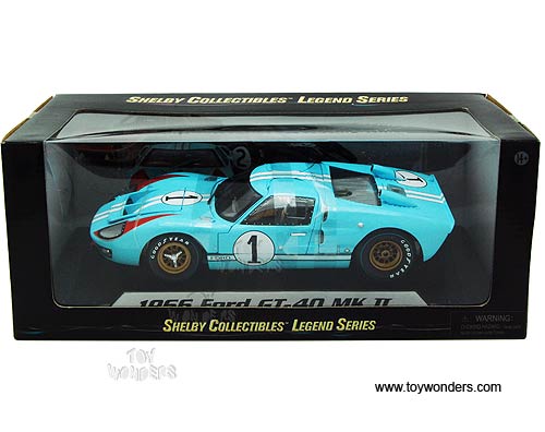 SC411BU Shelby - 1966 Ford GT-40 MK II Hardtop #1. 1:18 scale diecast collectible model car. This Ford GT40 Mark II is a 9.25"L x 3.75"W x 3.25"H diecast metal car with openable doors, hood and trunk. PVC tires, detailed engine, interior and chassis. Mounted on a display platform. This 1966 Ford GT-40 MK-II is manufactured by Shelby Collectibles, Inc. Individually packed in a window box. Box size: 12.5"L x 5.75"W x 5"H. SC411BU is in GULF BLUE color with White stripes.