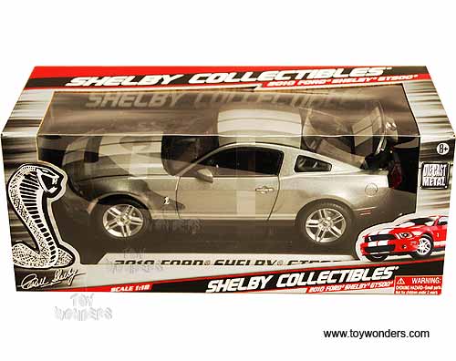 DC11813 Shelby - 2010 Ford Shelby GT500 Hard Top. 1:18 scale diecast collectible model car. This Ford Shelby GT-500 is a 10"L x 3.5"W x 2.75"H die cast metal car with openable doors, hood and trunk. Mounted on a display platform. This 2010 Ford Shelby GT500 is manufactured by Shelby Collectibles, Inc. Individually packed in a window box. Box size: 12.5"L x 5.75"W x 5"H. DC11813 is in GREAY color with Silver stripes.