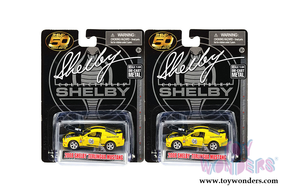 SC753YL Shelby - Shelby® 50th Anniversary 2008 Ford Shelby Mustang #08 Terlingua Racing Team. 1:64 scale diecast collectible models. These cars are 2.75" long die-cast metal car. Opening hood and doors. Detailed interiors, exteriors. Each car Individually blister carded. Card size: 7.5" x 6". Manufactured by Shelby Collectibles. Item SC753YL is in Yellow with Black stripes.