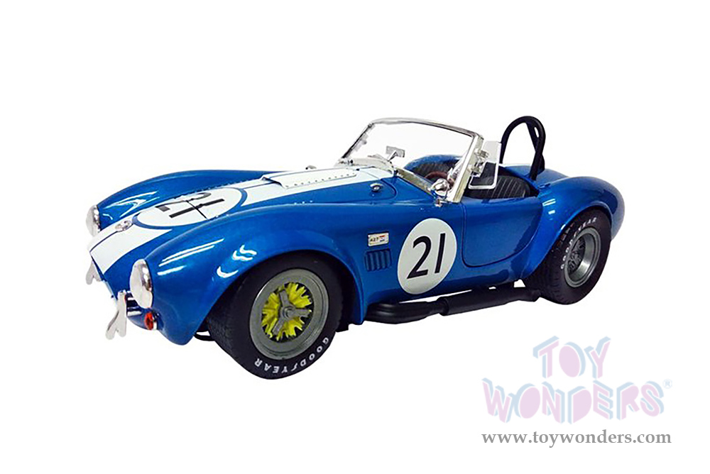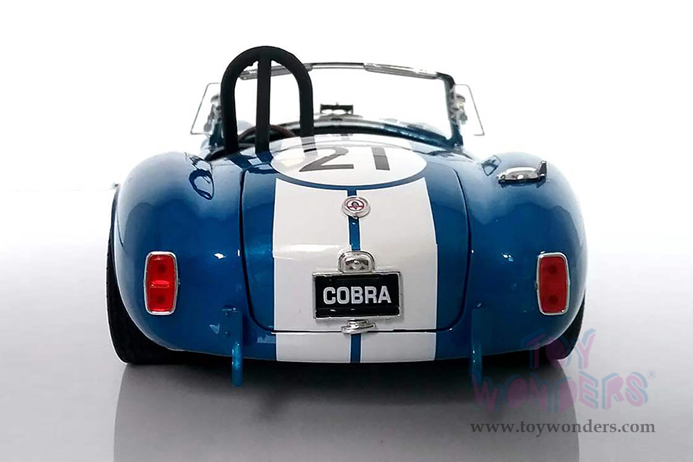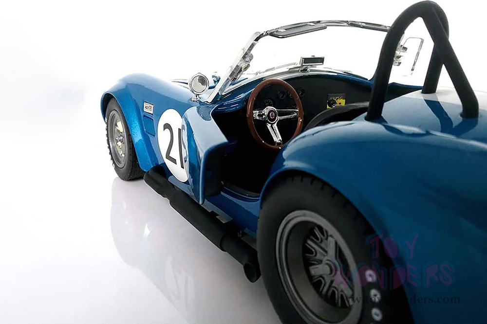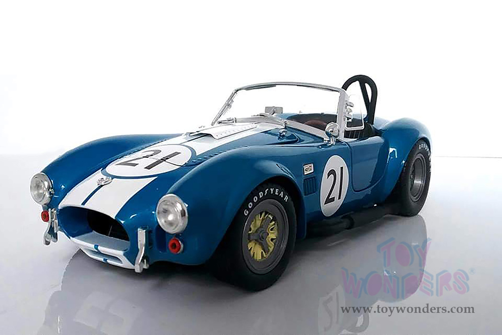 SC112BU Shelby - 1965 Shelby Cobra 427 S/C #21 Convertible. 1:18 scale diecast collectible model car. This Shelby Cobra 427 S/C is a 9.5"L x 4"W x 2.75"H diecast metal car with openable doors, hood, and trunk. Chrome detailed accessories, detailed engine, interior and chassis. Mounted on a display platform. This 1965 Shelby Cobra 427 S/C is manufactured by Shelby Collectibles, Inc. Individually packed in a window box. Box size: 12.5"L x 5.75"W x 5"H. SC112BU is in BLUE color with White stripes.
