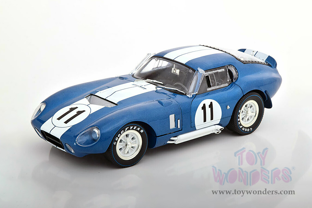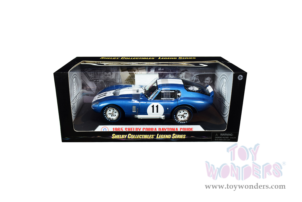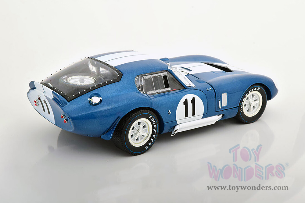 SC149BU Shelby - 1965 Shelby Cobra Daytona Coupe #11. 1:18 scale diecast collectible model car. This Shelby Cobra is a 9.25"L x 4"W x 2.5"H diecast metal car with openable doors, hood, and trunk. Chrome detailed accessories, detailed engine, interior and chassis. Mounted on a display platform. This 1965 Shelby Cobra is manufactured by Shelby Collectibles, Inc. Individually packed in a window box. Box size: 12.5"L x 5.75"W x 5"H. SC149BU is in BLUE color with White stripes.