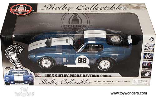 28901BU SHELBY COLLECTIBLES - 1965 Shelby Cobra Daytona Coupe Hard Top. 1:18 scale diecast collectible model car. This Shelby Cobra Daytona is an 8.75"Lx 3.5"Wx 2.5"H die cast metal car with openable doors, hood & trunk, authentically detailed engine, interior and chassis, chrome detailed accessories. Mounted on a display platform. Individually packed in a window box. Box size: 12.5"Lx 4.5"Wx 5"H. 28901BU is in BLUE color with White stripes.