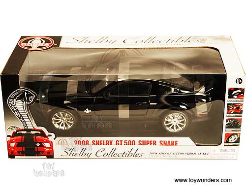 DC08SS05 Shelby - 2008 Shelby GT500 Super Snake Hard Top. 1:18 scale diecast collectible model car. This Shelby GT-500 Super Snake is a 10"L x 3.5"W x 2.75"H die cast metal car with openable doors, hood and trunk. Mounted on a display platform. This 2008 Shelby GT500 Super Snake is manufactured by Shelby Collectibles, Inc. Individually packed in a window box. Box size: 12.5"L x 5.75"W x 5"H. DC08SS05 is in BLACK color with Black stripes.