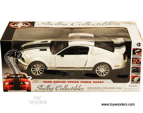 DC08SS04 Shelby - 2008 Shelby GT500 Super Snake Hard Top. 1:18 scale diecast collectible model car. This Shelby GT-500 Super Snake is a 10"L x 3.5"W x 2.75"H die cast metal car with openable doors, hood and trunk. Mounted on a display platform. This 2008 Shelby GT500 Super Snake is manufactured by Shelby Collectibles, Inc. Individually packed in a window box. Box size: 12.5"L x 5.75"W x 5"H. DC08SS04 is in WHITE color with Black stripes.
