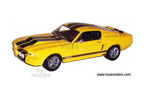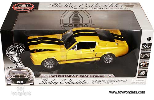 DC500EYL Shelby Collectible - 1967 Shelby Mustang GT 500E Hard Top. 1:18 scale diecast collectible model car. This GT500E is a 10"Lx 3.5"Wx 2.75"H die cast metal car with opening doors, hood and trunk. Mounted on a display platform. Individually packed in a window box. Box size: 14.25"Lx 7"Wx 6.25"H. DC500E is in YELLOW color with Black stripes.