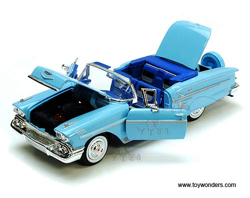 73267 Showcasts - 1958 Chevrolet Impala Convertible. 1:24 scale diecast collectible model car. This Chevy Impala is an 8.75"L x 3.5"W x 2"H diecast metal car with free wheeling, steerable front wheels, and openable doors, hood & trunk. Individually packed in a window box WB. Box measures 9.75"L x 4.5"W x 4"H. Manufactured by Motor Max. 73267BU/6 is in BLUE color.