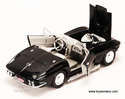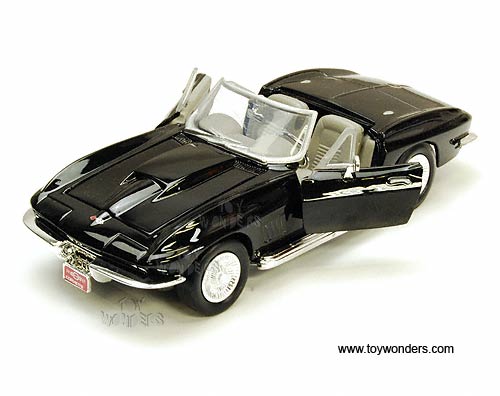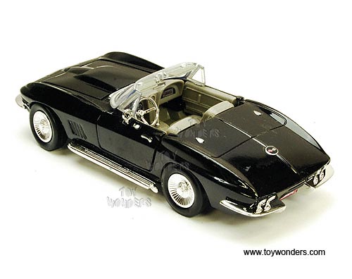 73224 Showcasts - 1967 Chevy Corvette Convertible. 1:24 scale diecast collectible model car. This Chevrolet is 7"L x 3"W x 2"H die cast metal plastic, free wheeling, openable doors & hood. This Chevy Corvette is manufactured by Motor Max Toys (Motormax). Each individually window box WB, box size is 9.75"L x 4.3"W x 4"H. 73224 in BLACK color. GM is a trademark of the General Motors Corporation.