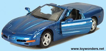 73211D Showcasts - 1998 Chevrolet Corvette Convertible. 1:24 scale diecast collectible model car. This 1998 Chevy Corvette is a 7"Lx 3"Wx 2"H diecast sports convertible with openable doors & hood and free wheeling. This 98 Chevy Corvette is manufactured by Motormax for Showcasts collectibles. 4 pcs per display box and 73211 in assorted colors. 16 pcs per inner box. GM is a trademark of the General Motors Corporation.