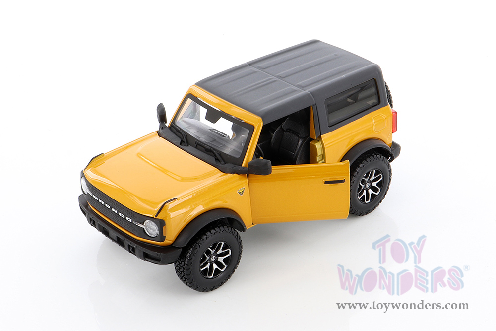 38530OR Showcasts® Collectibles - 2021 Ford Bronco Badlands. 1:24 scale diecast collectible model car. This Bronco is a 7.25"L x 3.75"W x 3"H diecast metal car with freewheeling and openable doors. Item 38530OR is in orange. Individually packed in a window box. Box size: 9.25"Lx 4.5"Wx 4.125"H.