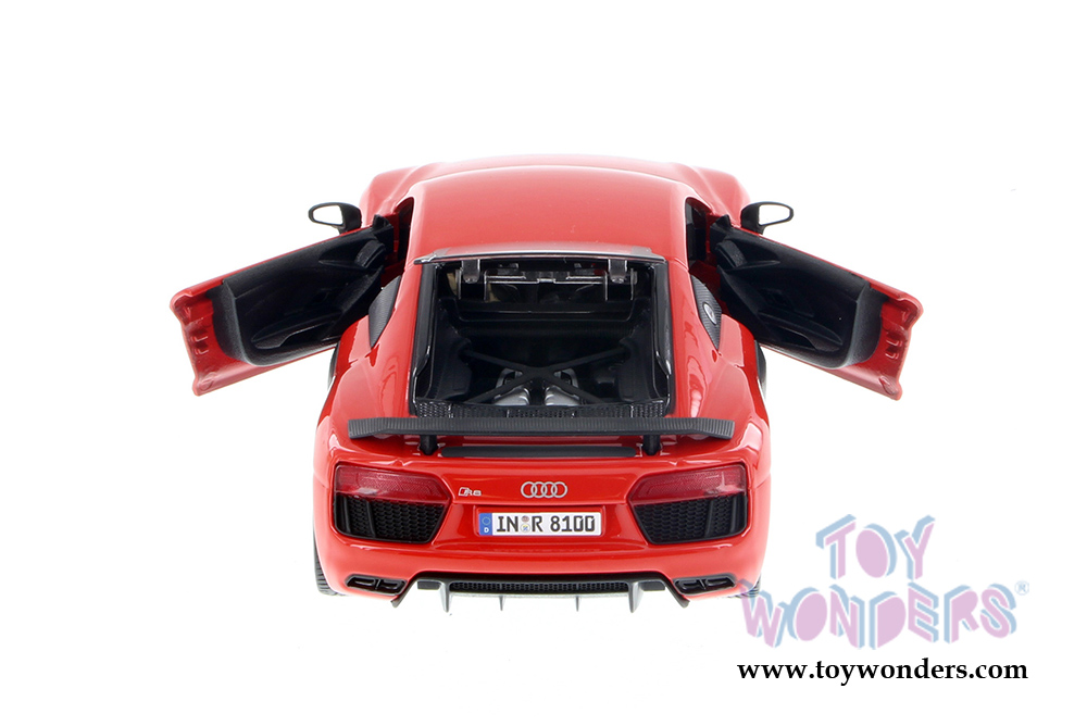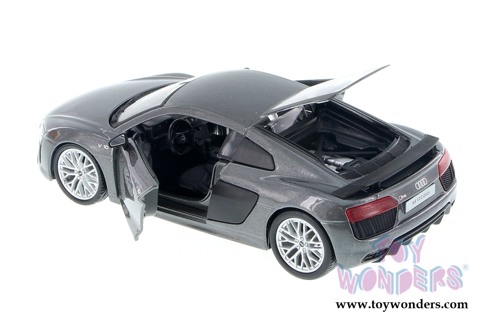34513/81 Showcasts Collectibles - Audi R8 Assortment Hard Top. Assortment includes Audi R8 and Audi R8 V10 Plus. 1:24 scale diecast collectible model car. These Audi R8 is are 7.25"L x 3"W x 2.25"H die cast metal car with free wheeling, openable doors & trunk. Item 34513/81 is in assorted colors and styles. These Audi R-8 are manufactured by Maisto for Showcasts Collectibles. 4 pcs per display box.