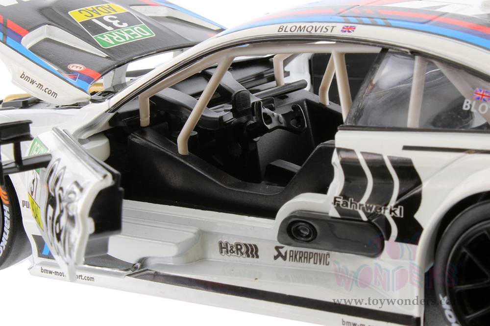 68256W Showcasts® Collectibles - BMW M4 DTM. 1:24 scale diecast collectible model car. This BMW is an 8.25"L x 3.5"W x 2"H die-cast metal car with freewheeling, steering wheel. Openable doors and hood. 68256W is in white. Individually packed in a window box. Box size: 9.75"Lx 4.25"Wx 4"H.