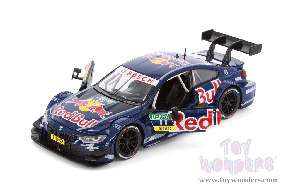 68295D Showcasts® Collectibles - BMW M4 DTM with Red Bull Racing Livery. 1:24 scale diecast collectible model car. This BMW is an 8.25"L x 3.25"W x 2"H die-cast metal car with freewheeling, steering wheel. Openable doors and hood. 4 pcs per display box in dark blue with Red Bull racing graphics.