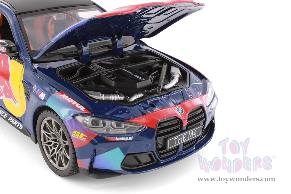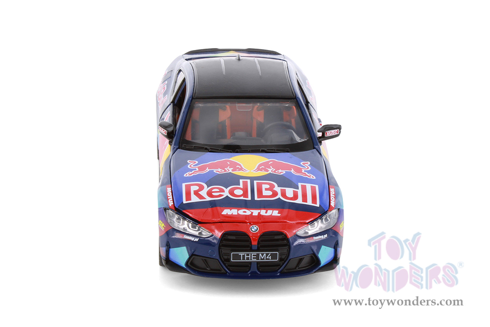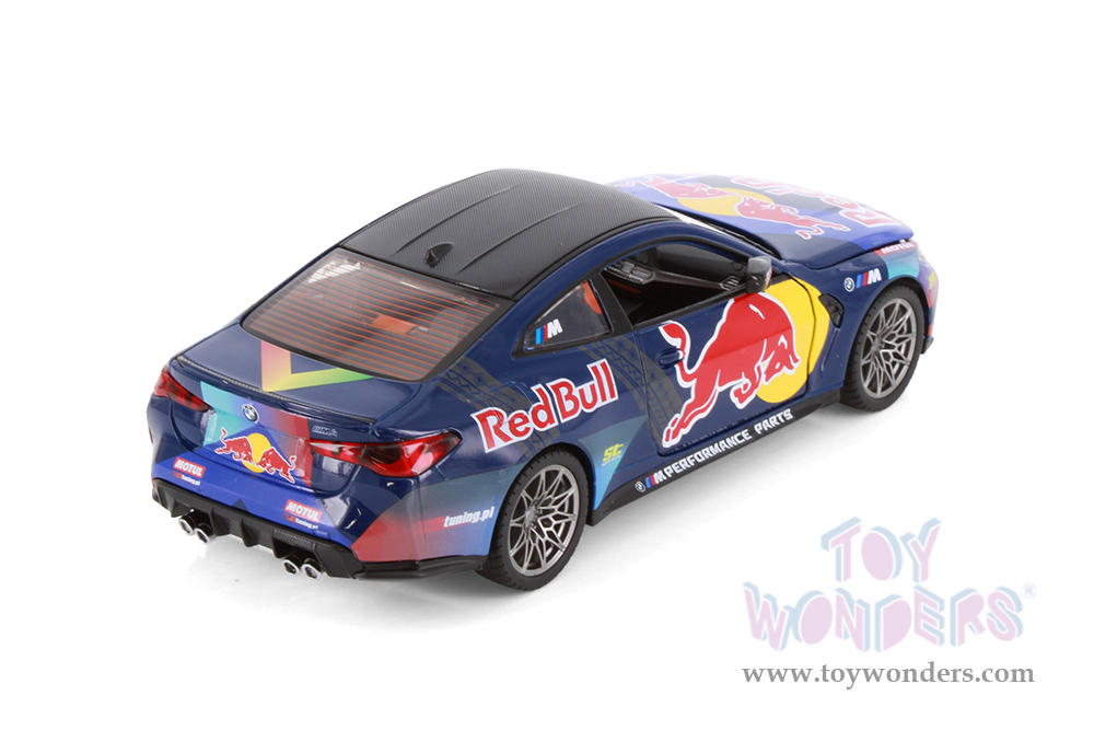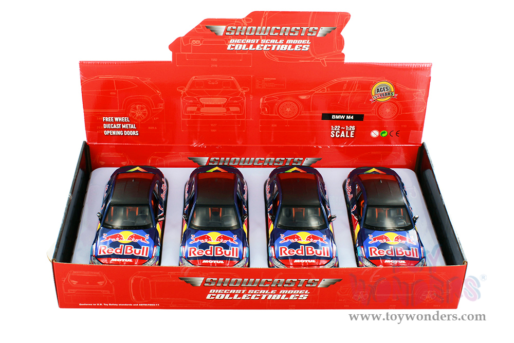 68292D Showcasts® Collectibles - BMW M4 (G82) with Red Bull Racing Livery. 1:23 scale diecast collectible model car. This BMW is an 8"L x 3"W x 2.25"H die-cast metal car with freewheeling, steering wheel. Openable doors and hood. 4 pcs per display box in dark blue with Red Bull racing graphics.