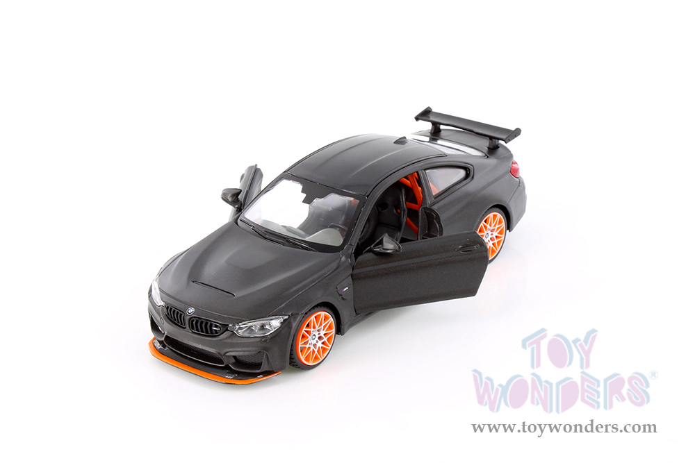 37246 Showcasts® Collectibles - BMW M4 GTS. 1:24 scale diecast collectible model car. This BMW is an 8"L x 3"W x 2.25"H diecast metal car with openable doors. Freewheeling. 4 pcs per display box in matte gray with orange rims.