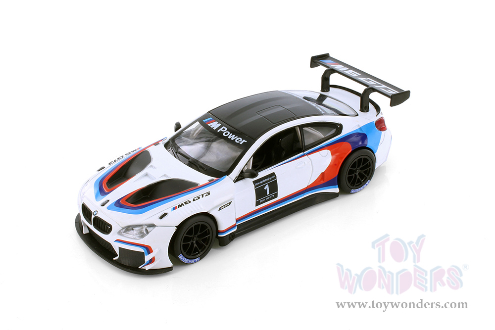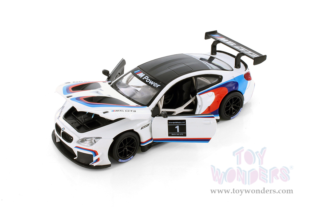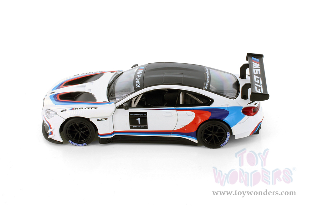 68255W Showcasts® Collectibles - BMW M6 GT3 #1. 1:24 scale diecast collectible model car. This BMW is an 8.25"L x 3.5"W x 2"H die-cast metal car with freewheeling, steering wheel. Openable doors and hood. 68255W is in white. Individually packed in a window box. Box size: 9.75"Lx 4.25"Wx 4"H.