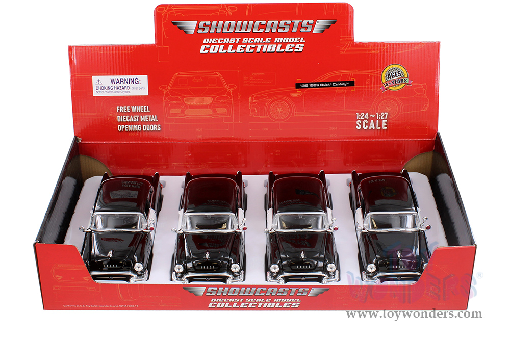 34295 Showcasts Collectibles® - 1955 Buick Century California Highway Patrol. 1:24 scale diecast collectible model car. This Buick Century is a 7.75"L x 2.75"W x 2.25"H diecast metal car with freewheeling, openable hood, and doors. 4 pcs per display box in black and white. GM is a trademark of the General Motors Corporation.