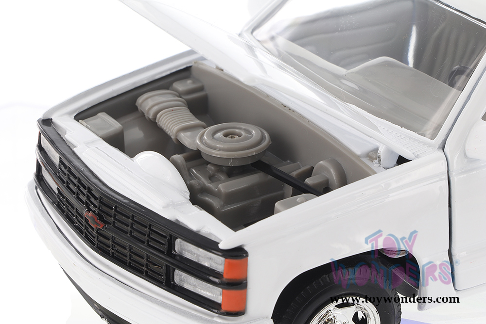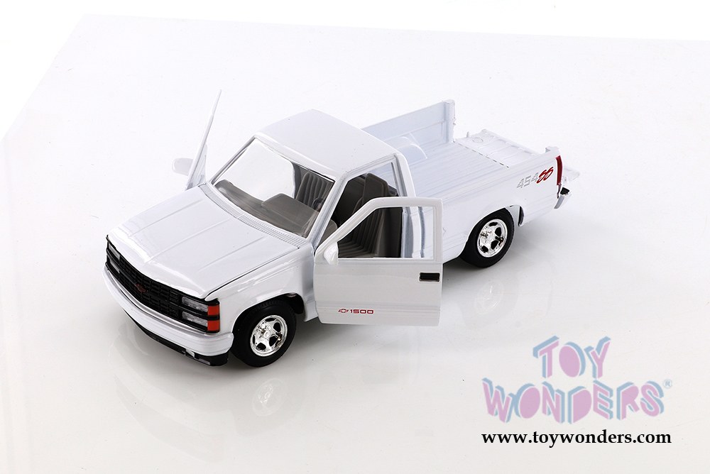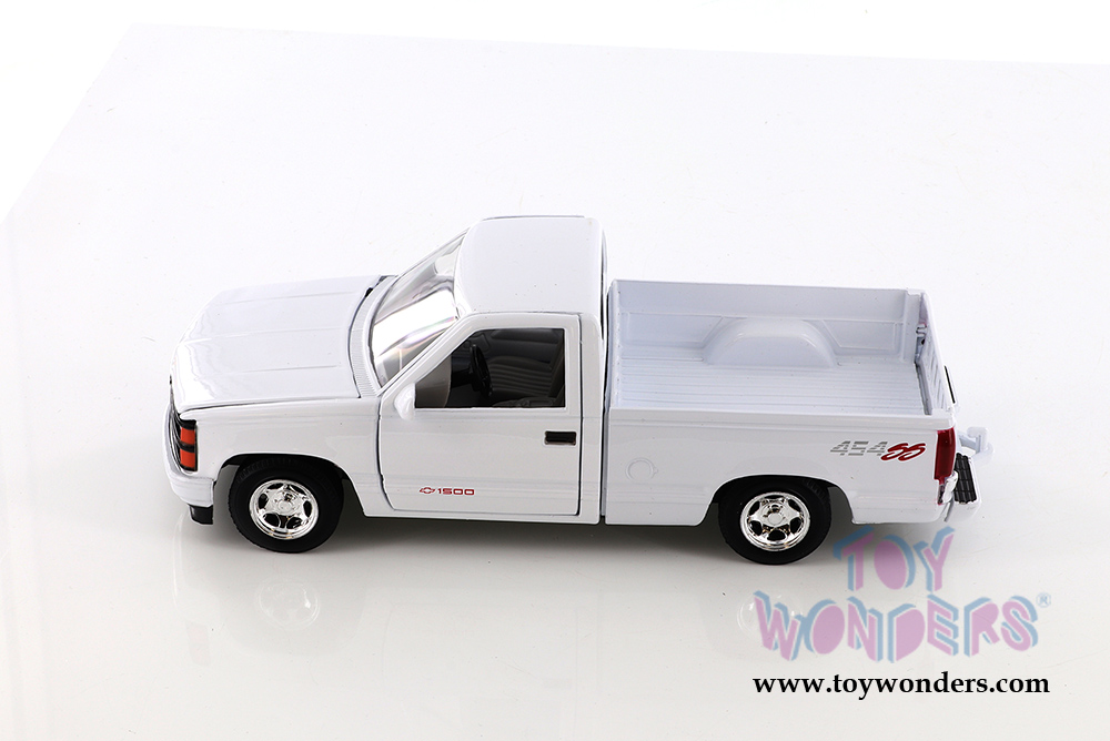 73203WT/16D Showcasts Collectibles - 1992 Chevrolet® 454 SS™ Pickup Truck Scale: 1:24 This Chevy® 454SS Pickup Truck is an 8.25" L x 3"W x 2.75"H diecast metal pickup truck with working steering, opening doors, hood and tailgate. GM is a trademark of the General Motors Corporation. Manufactured by Motormax for Showcasts Collectibles 4 pcs per display box in White.