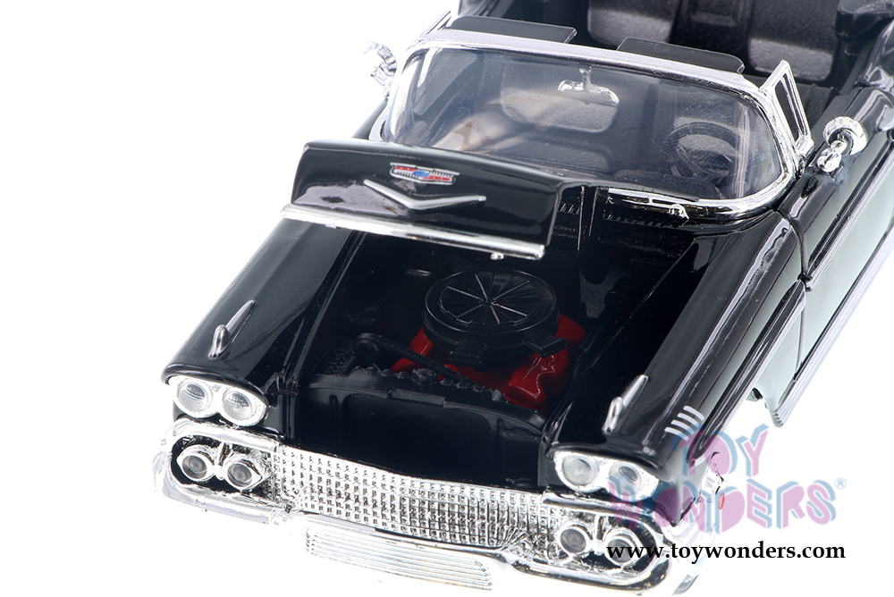 73267AC/BK Showcasts Collectibles - 1958 Chevrolet Impala Convertible. 1:24 scale diecast collectible model car. This Chevy Impala is an 8.75"L x 3.5"W x 2"H diecast metal car with freewheeling, steerable front wheels, openable doors, hood, and trunk. Individually packed in a window box. Window Box measures 9.75"L x 4.5"W x 4"H. Manufactured by Motor Max for Showcasts Collectibles. 73267AC/BK is in BLACK.