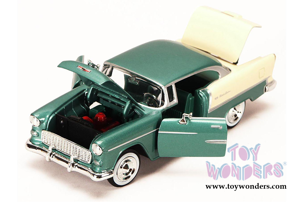 73229AC/GN Showcasts Collectibles - 1955 Chevy Bel Air Hard Top. 1:24 scale diecast collectible model car. This 1955 Chevrolet Belair is an 8" long diecast classic oldies with openable doors, hood & trunk and workable steering. This 1955 Chevy Bel-Air is manufactured by Motor Max Toys for Showcasts Collectibles. 73229AC/GN is in GREEN color. Individually packed in a window box WB. Box size: 9.75"Lx 4.3"Wx 4"H. GM is a trademark of the General Motors Corporation.