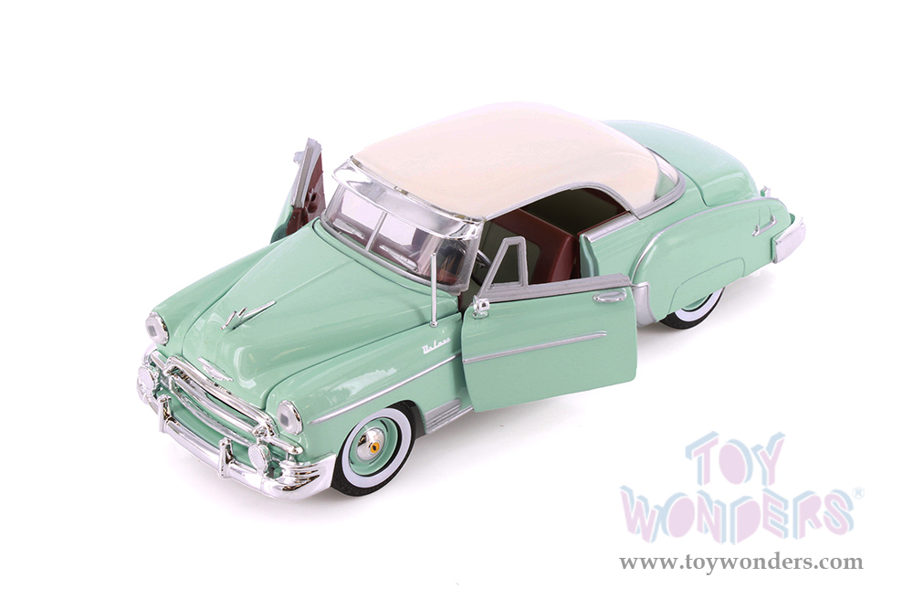77268D Showcasts® Collectibles - 1950 Chevy® Bel Air® Hardtop. 1:24 scale diecast model car. This Chevrolet® Bel Air® is an 8"L x 3"W x 2.5"H die cast metal car with freewheeling, steerable front wheels, openable doors, hood and trunk. 4 pcs per display box. 77268D is in assorted colors. GM is a trademark of the General Motors Corporation.