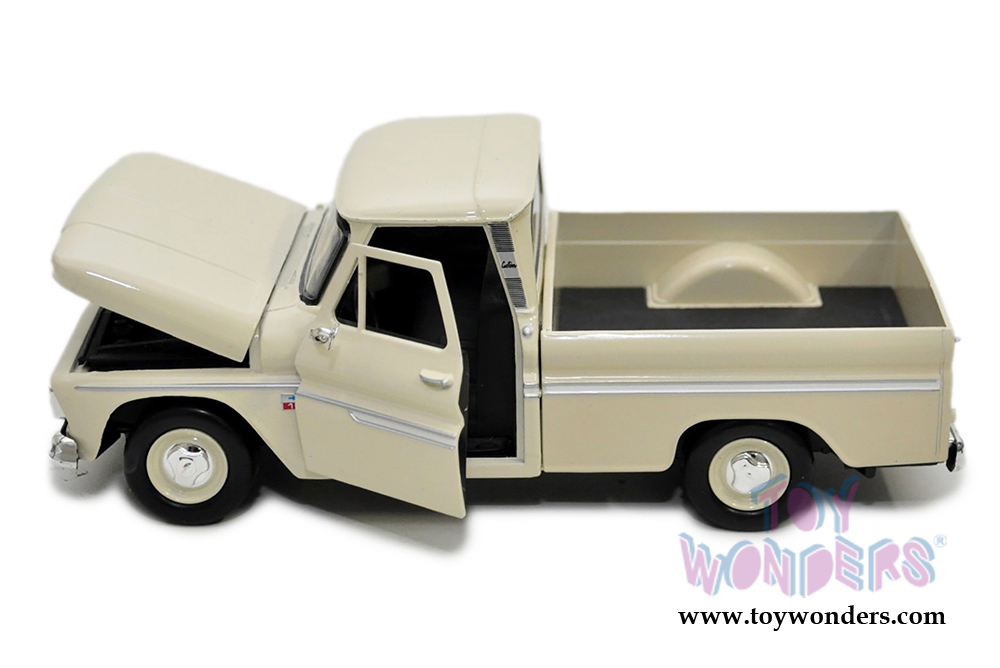73355AC/CS Showcasts Collectibles - 1966 Chevy C10 Fleetside Pickup truck. 1:24 scale diecast collectible model car. This Chevrolet C-10 Fleetside Pickup measures 7.5"L x 3.25"W x 2.75"H diecast classic car with steerable front wheels, openable doors, and hood. This 66 Chevy C10 Fleetside Pickup is manufactured by Motor Max Toys for Showcasts Collectibles. 73355AC/CS is in CASHMERE color (like cream). Individually packed in a window box. Window Box size: 9.75"L x 4.5"W x 4"H. GM is a trademark of the General Motors Corporation.