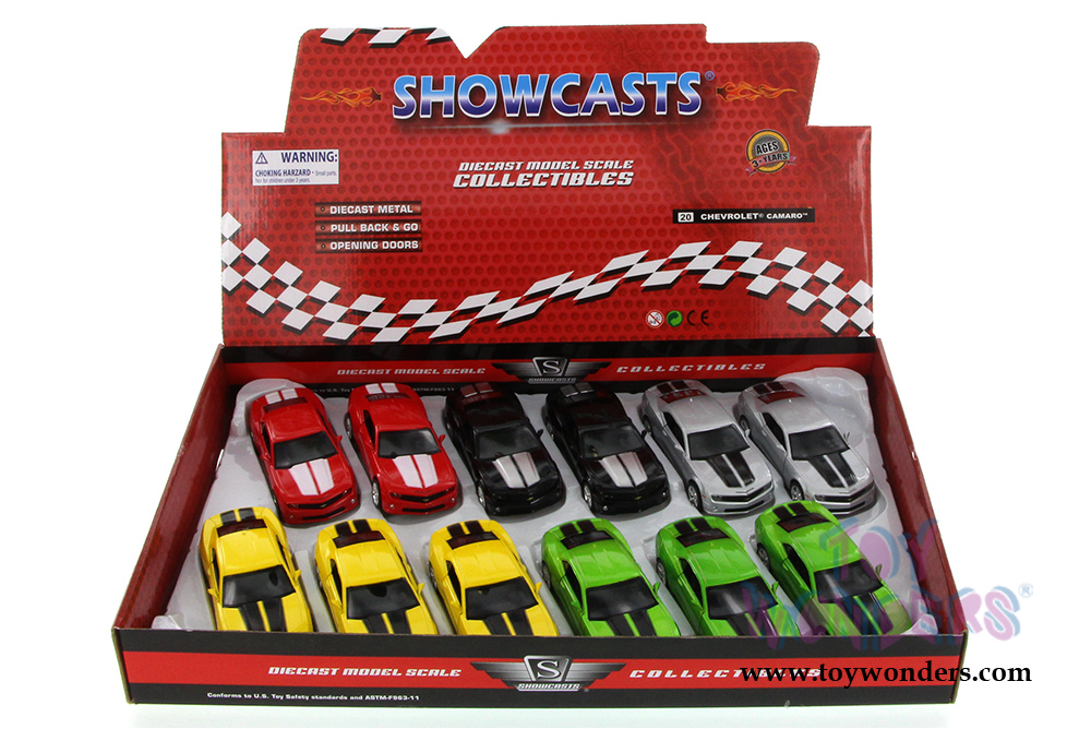 555005Z Showcasts Collectibles - 2010 Chevy Camaro Hard Top. Approximately 1:32 scale diecast collectible model car. This Chevrolet Camaro is a 5"L x 2"W x 1.5"H die cast metal car with pull back action. This 2010 Chevy Camaro is manufactured by Uni-Fortune for Showcasts Collectibles. 12 pcs per display box in assorted colors. 48 pcs per inner box. GM is a trademark of the General Motors Corporation.