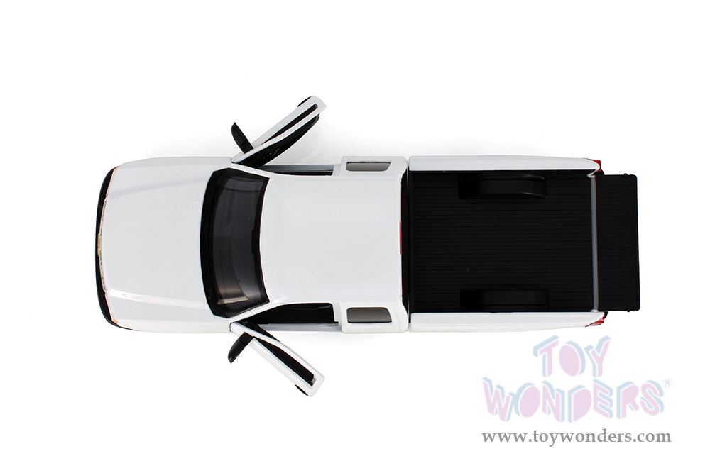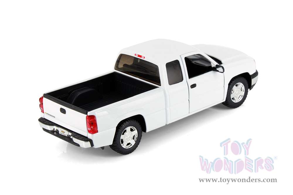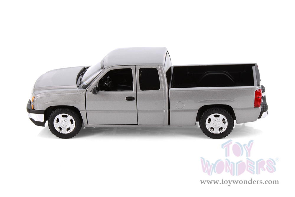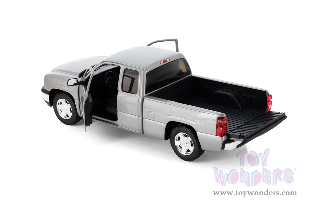 77393D Showcasts® Collectibles - 2006 Chevy® Silverado™ 1500 Double Cab Truck. 1:25 scale diecast model car. This Chevy® Truck is a 9" L x 3"W x 3"H diecast metal pickup truck with freewheeling, openable doors and tailgate. 4 pcs per display box. 77393D is in assorted colors. GM is a trademark of the General Motors Corporation.