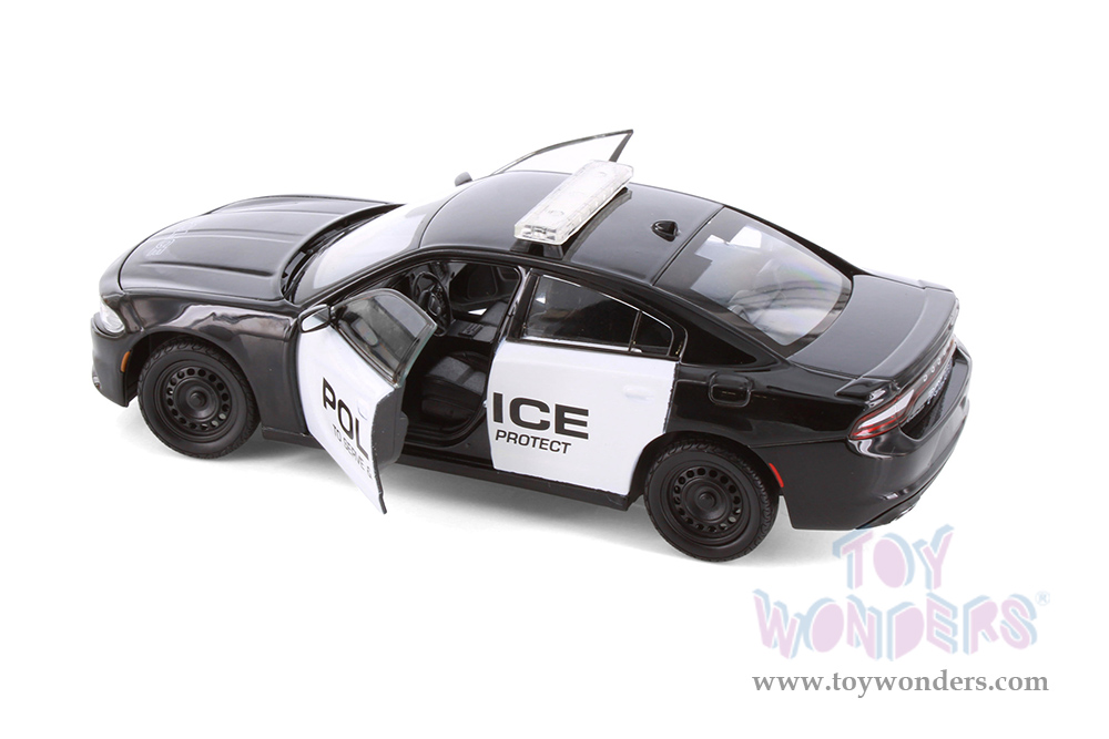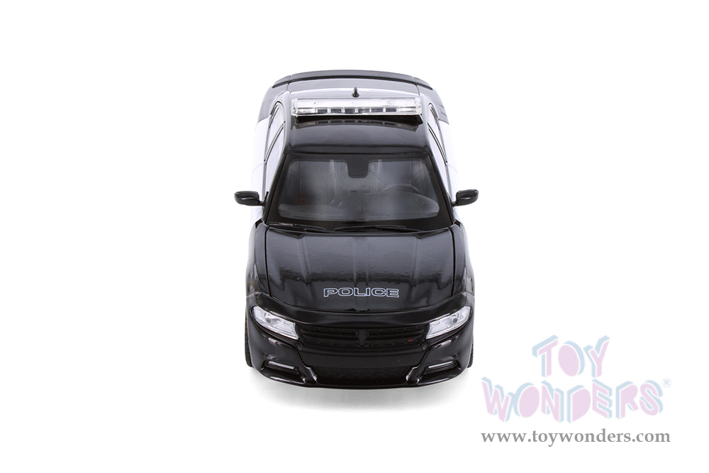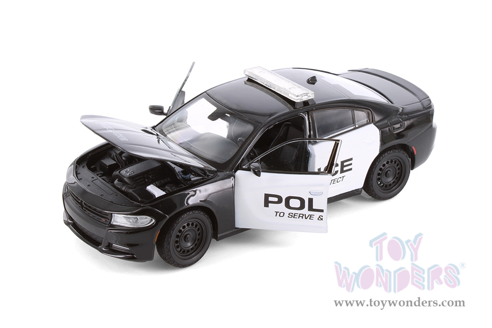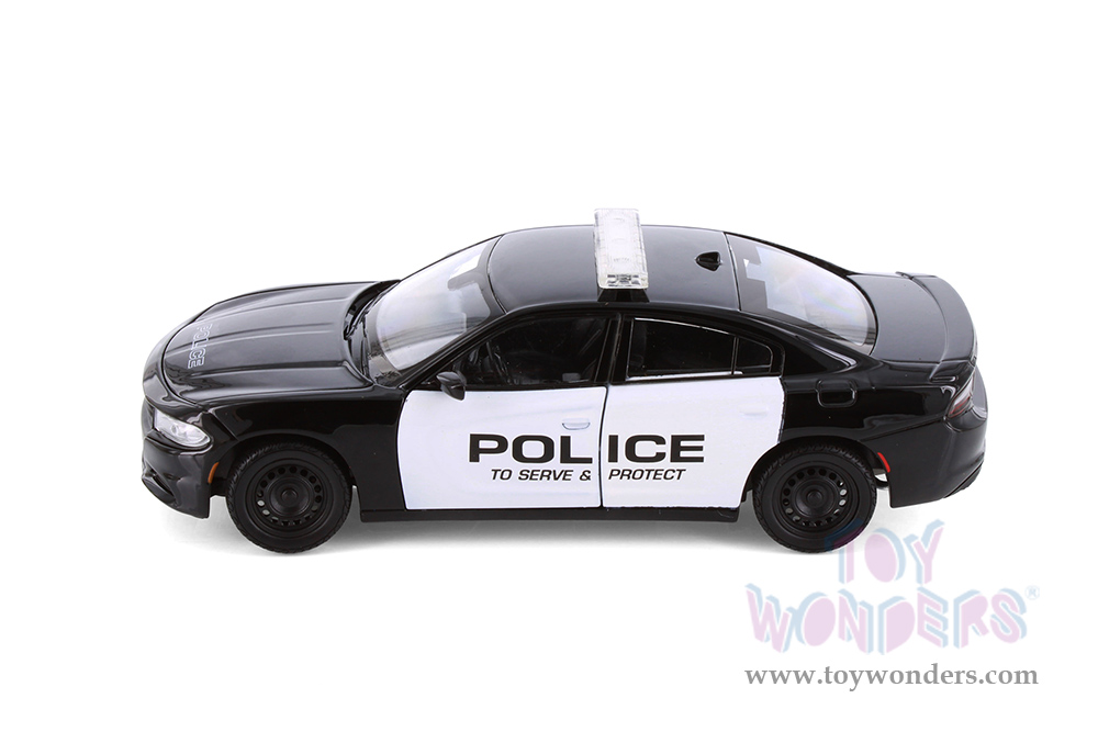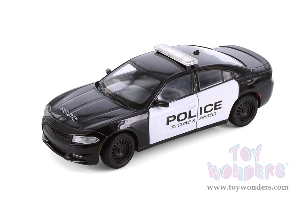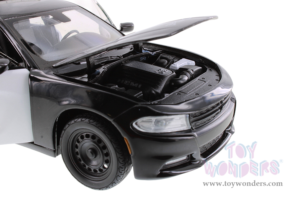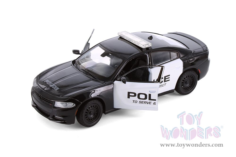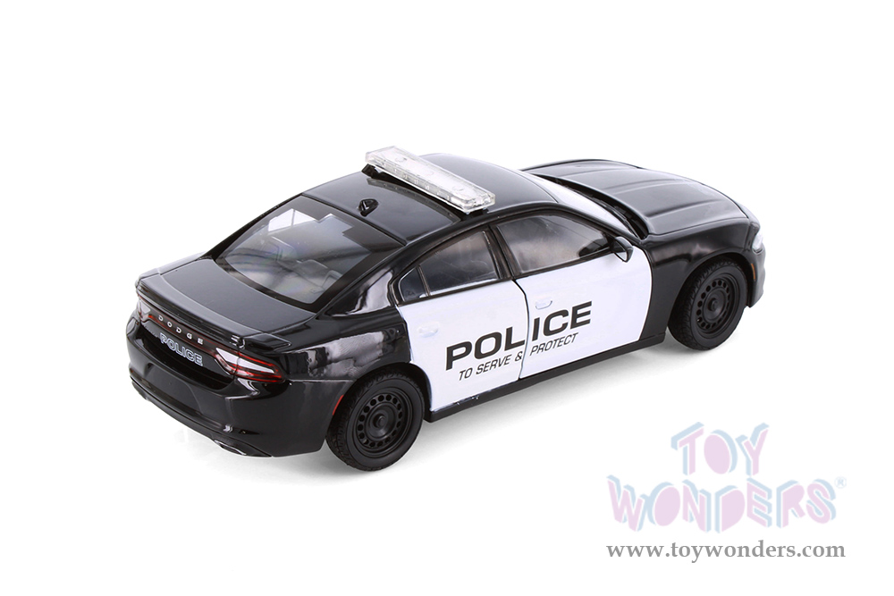 24079P/4D Showcasts® Collectibles - 2016 Dodge Charger Pursuit Police. 1:24 scale diecast collectible model car. This Police car is a 7.5"L x 3"W x 2.5"H diecast metal car with freewheeling, openable doors and hood. Item 24079P/4D is in black and white. 4 pcs per display box. 24 pcs per inner.