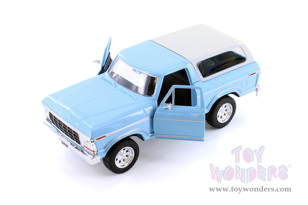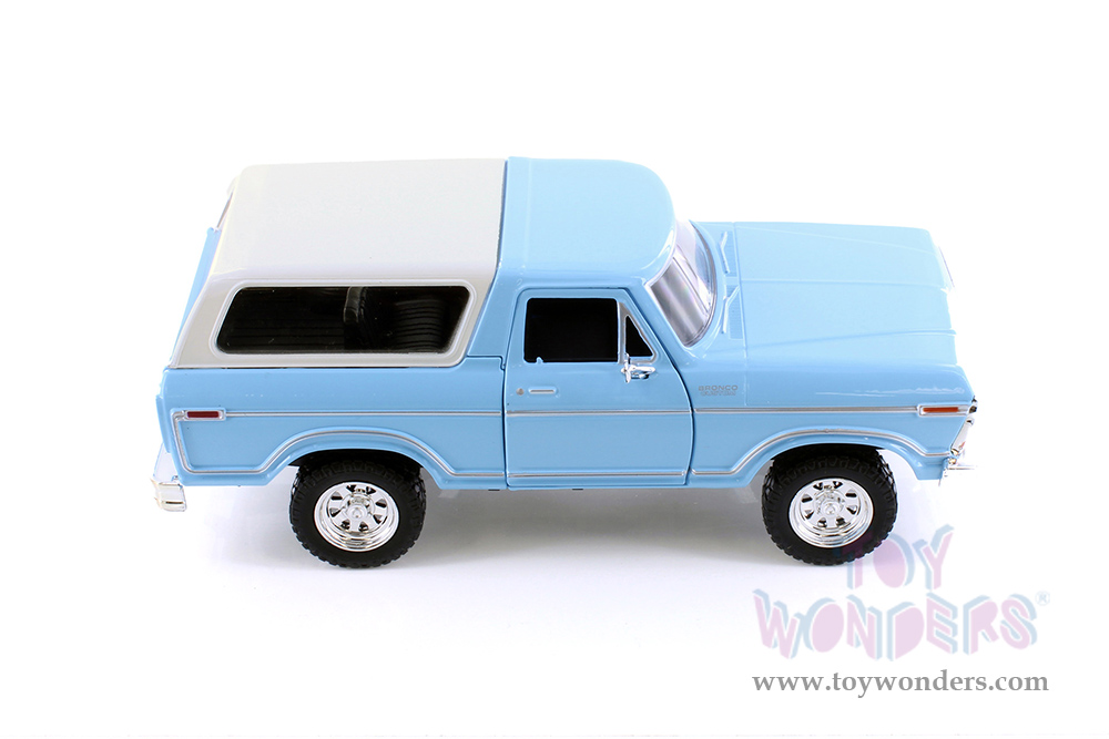 71373WBU Showcasts® Collectibles - 1978 Ford Bronco. 1:24 scale diecast collectible model car. This Ford Bronco is an 8"L x 3.5"W x 3"H diecast metal car with freewheeling, steerable front wheels, and openable doors. Has removable camper shell. Individually packed in a window box. Window Box measures 9.5"L x 4.25"W x 4"H. 71373WBU is in Light Blue and White Camper Shell.