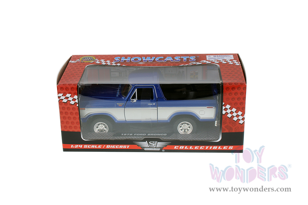 79372WBU Showcasts® Collectibles - 1978 Ford Bronco Ranger XLT (open top) with Spare Tire. 1:24 scale diecast collectible model car. This Ford Bronco is an 8.25"L x 3.5"W x 3"H diecast metal car with freewheeling, steerable front wheels, and openable doors. Individually packed in a window box. Window Box measures 9.5"L x 4.25"W x 4"H. The Ford Bronco is manufactured by Motor Max for Showcasts Collectibles. 79372WBU is in Blue and Silver.
