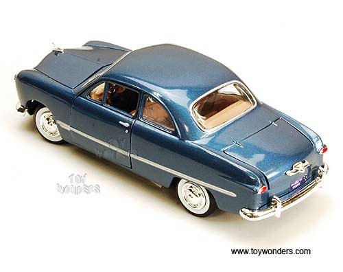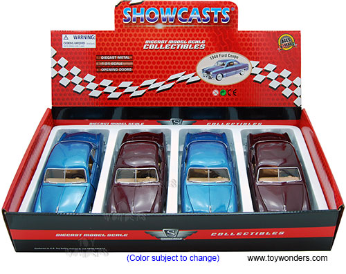 73213/16D Showcasts Collectibles - 1949 Ford Coupe Hardtop. 1:24 scale diecast collectible model car. This 1949 Ford Coupe classic oldies car is 8.25"L x 3"W x 2.5"H diecast metal with workable steering, freewheeling, openable doors, hood, and trunk. This 49 Ford Coupe is manufactured by Motormax for Showcasts Collectibles. 4 pcs per display box. Motor Max ref. no. 73213/16D in assorted colors.