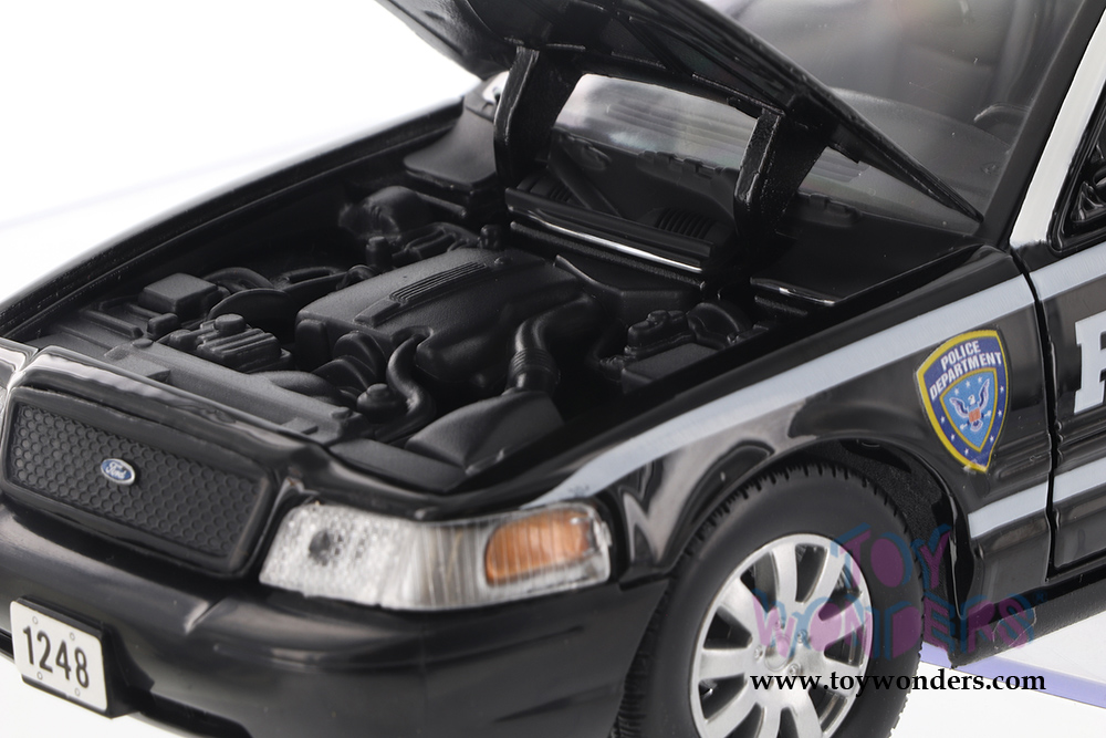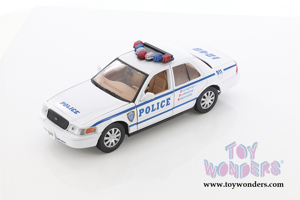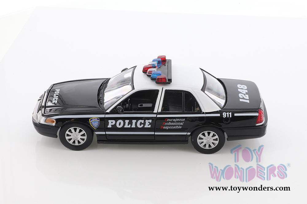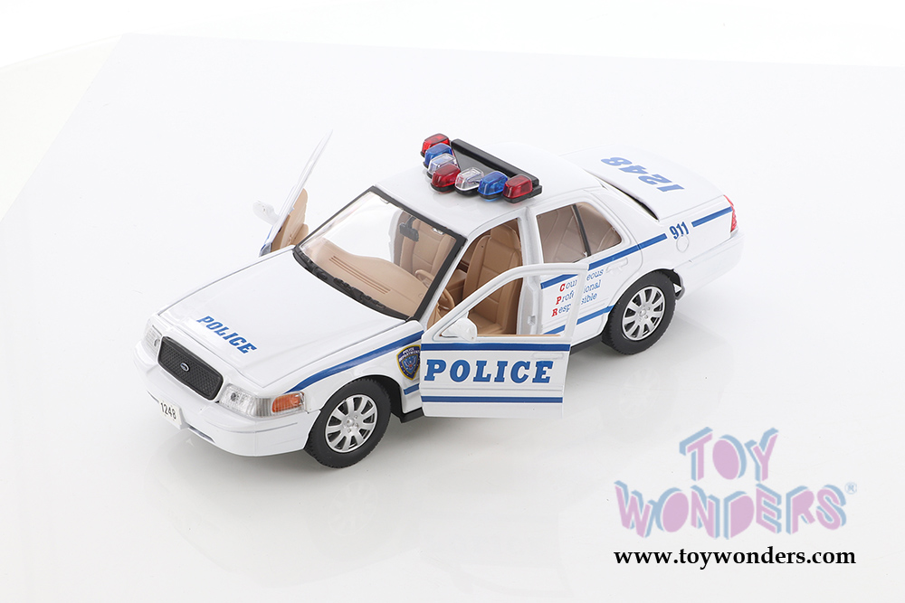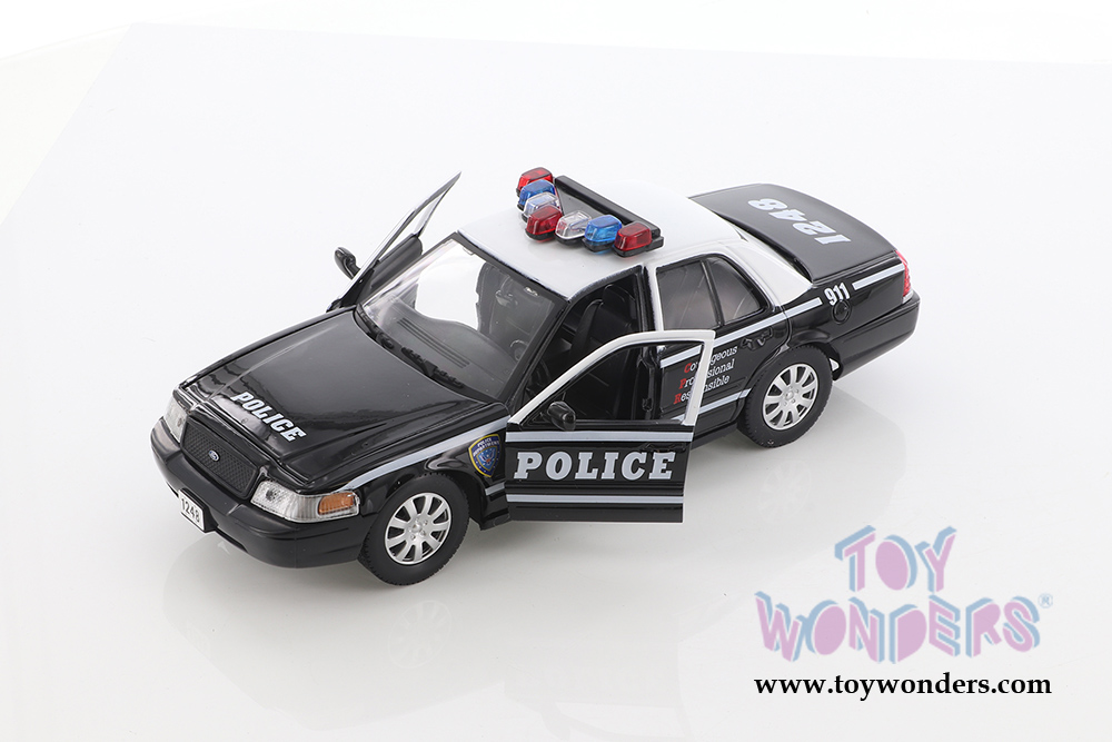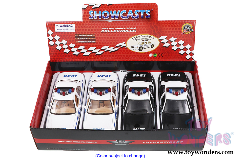 76482D/3 Showcasts Collectibles - 2010 Ford Crown Victoria Police Car. 1:24 scale diecast collectible model. This Ford Crown Victoria is an 8.75"L x 3.25"W x 3"H die cast police car, opening doors, and hood. Manufactured by Motor Max for Showcasts Collectibles. 4 pcs per display box in assorted colors. 16 pcs per carton.