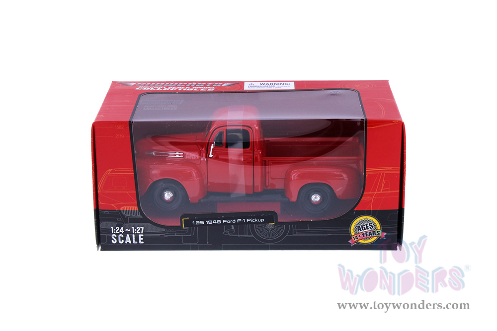 38935R Showcasts® Collectibles - 1948 Ford F-1 Pickup Truck. 1:25 (1:24) scale diecast collectible model car. This Ford F1 Pickup is a 7.25"Lx 2.75"W x 2.75"H diecast metal car with freewheeling, openable doors, and tailgate. Item 38935R is in red. Individually packed in a window box. Box size: 9.25"Lx 4.5"Wx 4.125"H.