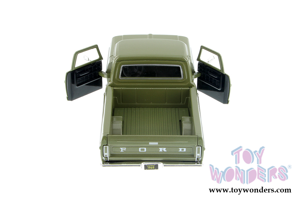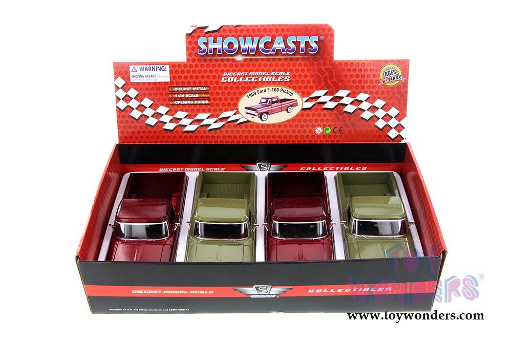 79315/16D Showcasts Collectibles - 1969 Ford F-100 Pickup truck. 1:24 scale diecast collectible model car. This 1969 Ford F100 is an 8"L x 3.25"W x 3"H diecast metal pickup truck with openable doors and hood. This 1969 Ford F 100 pickup truck is manufactured by Motormax for Showcasts Diecast Collectibles. 4 pcs per display box in assorted colors.